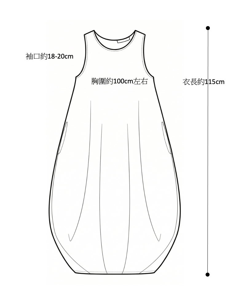 繭型無袖長洋裝,平常穿著S、M到小L皆可以購買,只需注意手臂粗細約20cm以內,無腰圍問題為寬鬆版,胸圍最大約100cm以內。