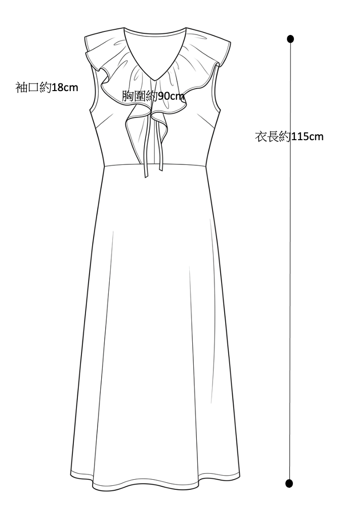 這款設計款洋裝,利用領口的荷葉滾邊營造出豐富的視覺張力,呈現出既甜美又知性的女性氣質。